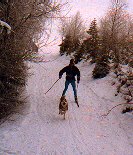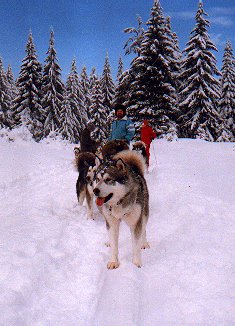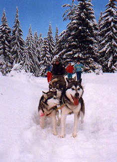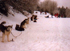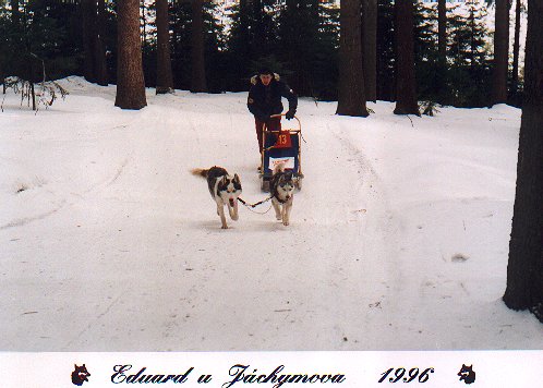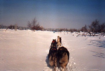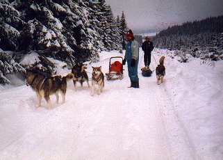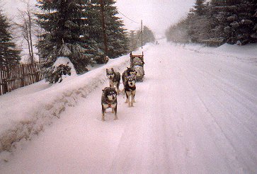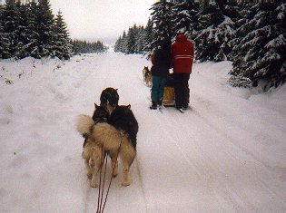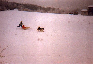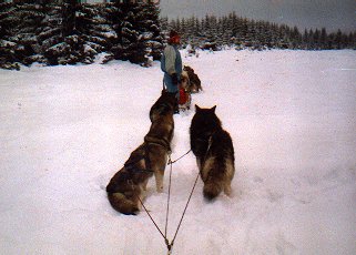 Druhý den musel jet Ivoš s Míšou na saních, protože si na jednom zrádném úseku cesty rozbil vázání o vykukující kameny. Psi byli při síle, nebyli jsme daleko od domova a tak to zvládli. Vaškova fena statečně táhla pulku a věci. Zpočátku z toho byla zmatená, ale pak si zvykla a jako by tahala odjakživa.