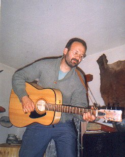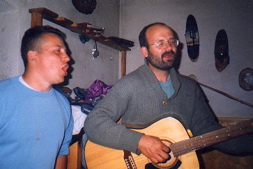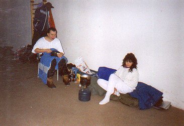 Noclehárnu jsme měli dole v tělocvičně za 20 Kč na noc. Péťa se zrovna živí, poté co nakrmil své miláčky a Ivetu.