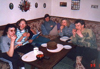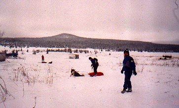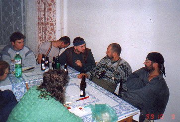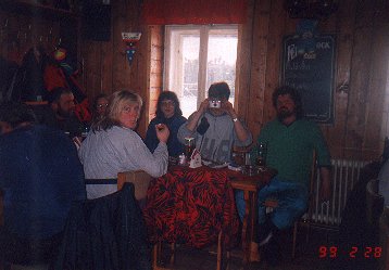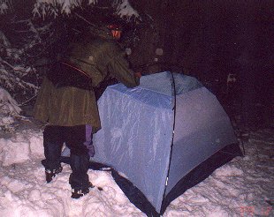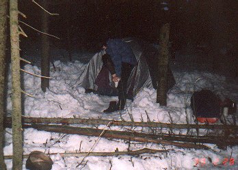 Protože spřežení byla rychlá a pulkaři pomalí, dali jsme si spicha v hospodě na Jelením, asi tři kilometry od našeho cíle. Dáša, Ivoš a Karel dorazili na Jelení kolem čtvrté hodiny. Po dobrém jídlo a protože se už začalo stmívat se Ivoš s Karlem rozhodli jet napřed. Dáša čekala na opozdilce. Asi v šest jsme společně ( Dáša, Milan, Vašek, Hubert, Jana a Líba) vyrazili do noci. Najít kemp, kde už musel být Ivoš s Karlem bylo trošku dobrodružství, neboť nikdo z nás v noci s čelovkou ještě nejel. Nakonec všechno dobře dopadlo a sešli jsme se na bývalém koncentráku u Přebuze. Tam jsme přespali. Noc jsme přežili ve zdraví, akorát zvěř z okolí musela zákonitě uprchnout - jak to ti naši mužští celou noc řezali. V noci střídavě sněžilo a svítil úplněk. V neděli se jelo stejnou cestou domů.