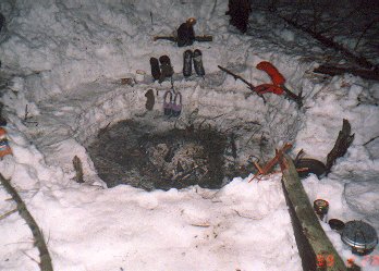 Kamarád Hubert pracně staví svoje iglú. Na dolní fotce je vidět, co mu z něj ráno zbylo.