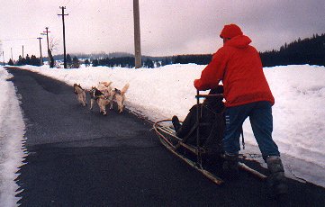 Malá část našeho trailu vedla i po silnici. Tam, kde už auto nemůže, psí spřežení jede dál.