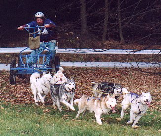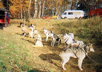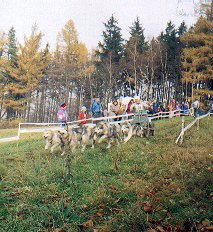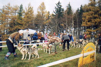 Sláva Pavlík zapřahá 12 psů plemen SH, AM a GP. Helma na hlavách závodníků je v tomto případě na správném místě.