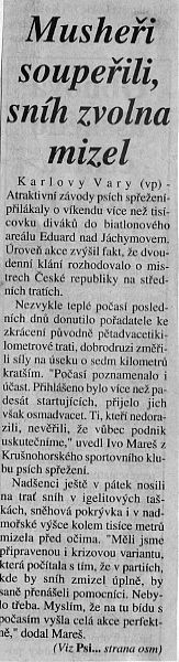 První den bylo sněhu tak na hraně a na sedmiapůlkilometrové trati se jelo pěkně. Ale k večeru začal padat déšť se sněhem, pak se přidal vítr a v noci už jen pršelo. Druhý den musela být trať o něco zkrácena a skijöring se už nejel vůbec.