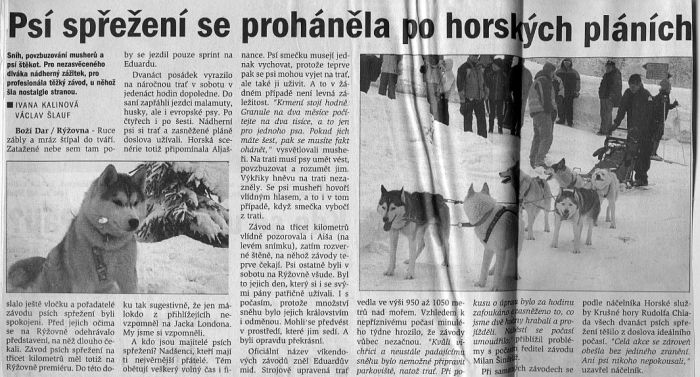 Já navrhuji zrušit závody. Tvrdím, že to je taky umění. Proč si nechávat dobrovolně nadávat od nespokojených musherů za nekvalitní trať. Milan bezmocně mlčí. Ale přesto obvolává veškeré zálohy. Všechny sportovní kluby a vlekaři v okolí si po sněhové nadílce upravují svoje. Zachraňuje nás známý s jednopásem Skidoo Skandic 600 SUV. Jeho skůtr je nový. Má najeto pouze 300 km. Je v záběhu a dotyčný ho bohužel nehodlá půjčit nikomu jinému než mě. Upisuji se mu vlastní krví a slibuju, že ho budu hýčkat a nepustím ho přes 5.000 ot.